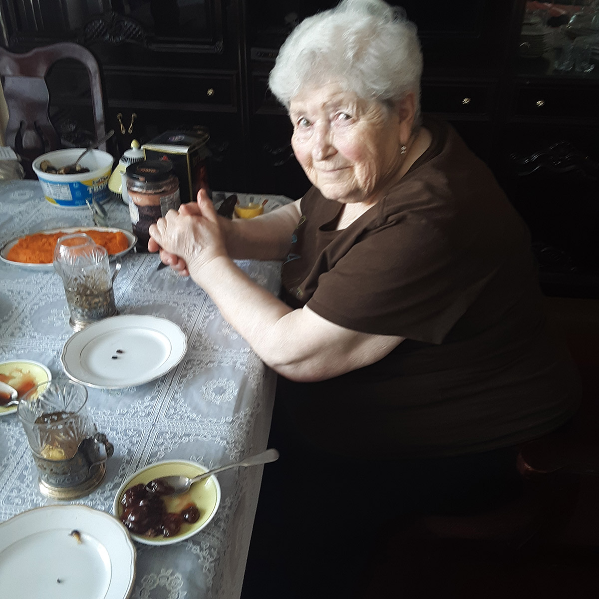Elderly woman sitting at a dining table with various dishes and jars, looking at the camera.