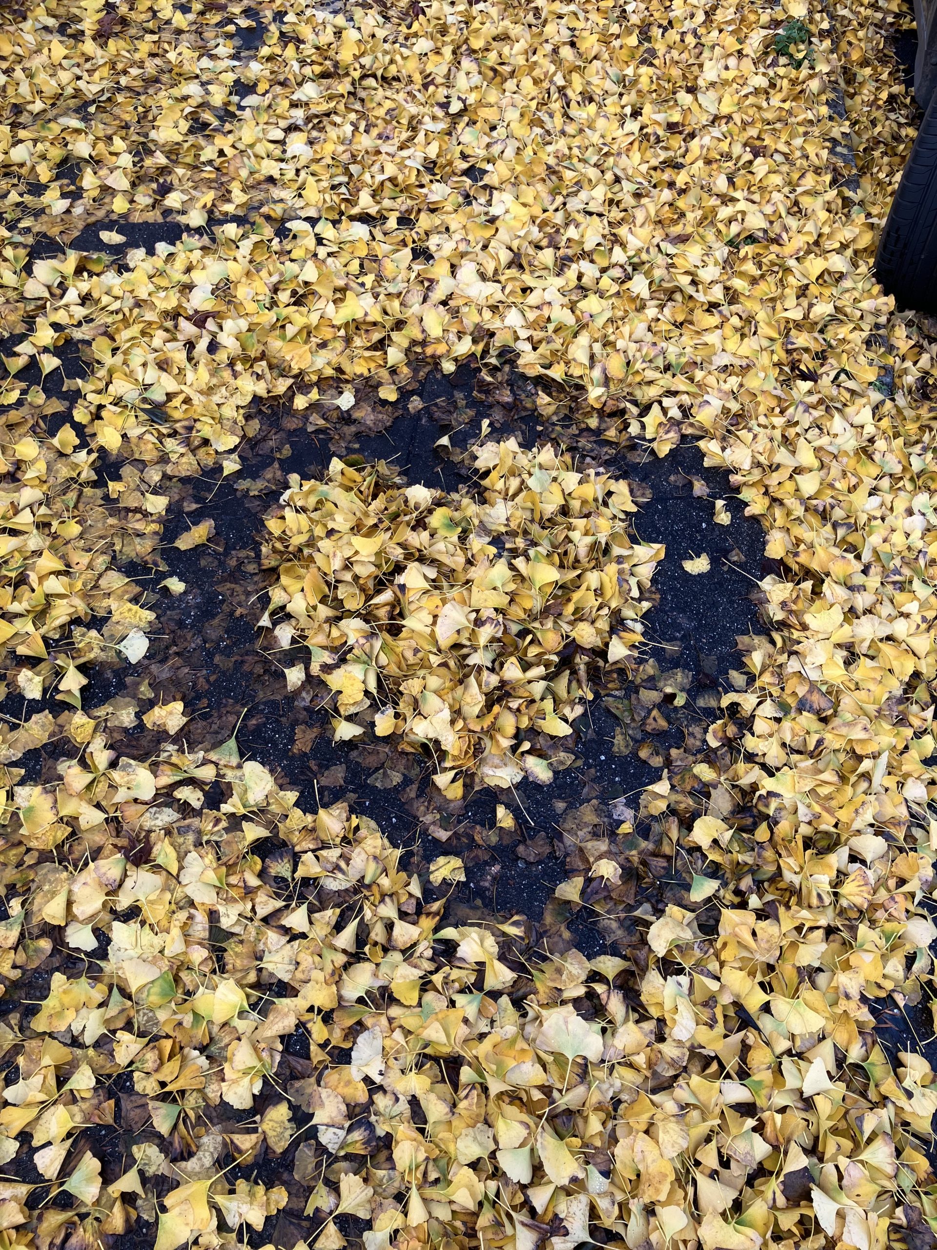 A heart shape is outlined on the ground, surrounded by a dense layer of yellow fallen leaves.