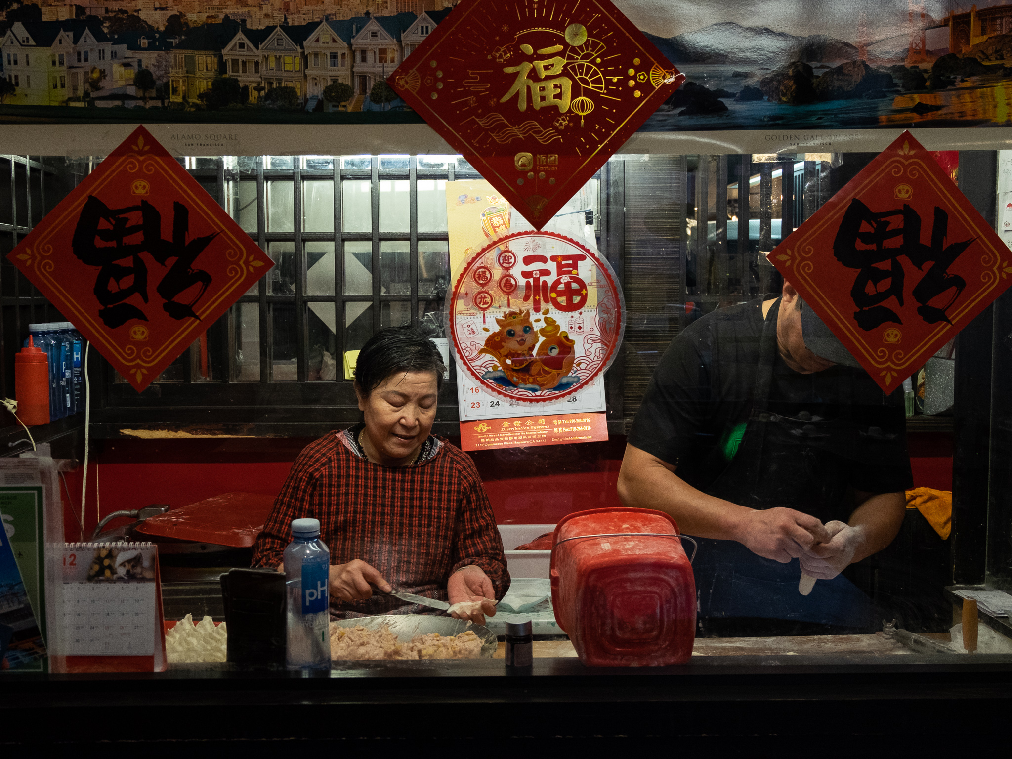 Two people prepare food behind a counter, surrounded by Chinese New Year decorations. One person is chopping ingredients, while the other is kneading dough.