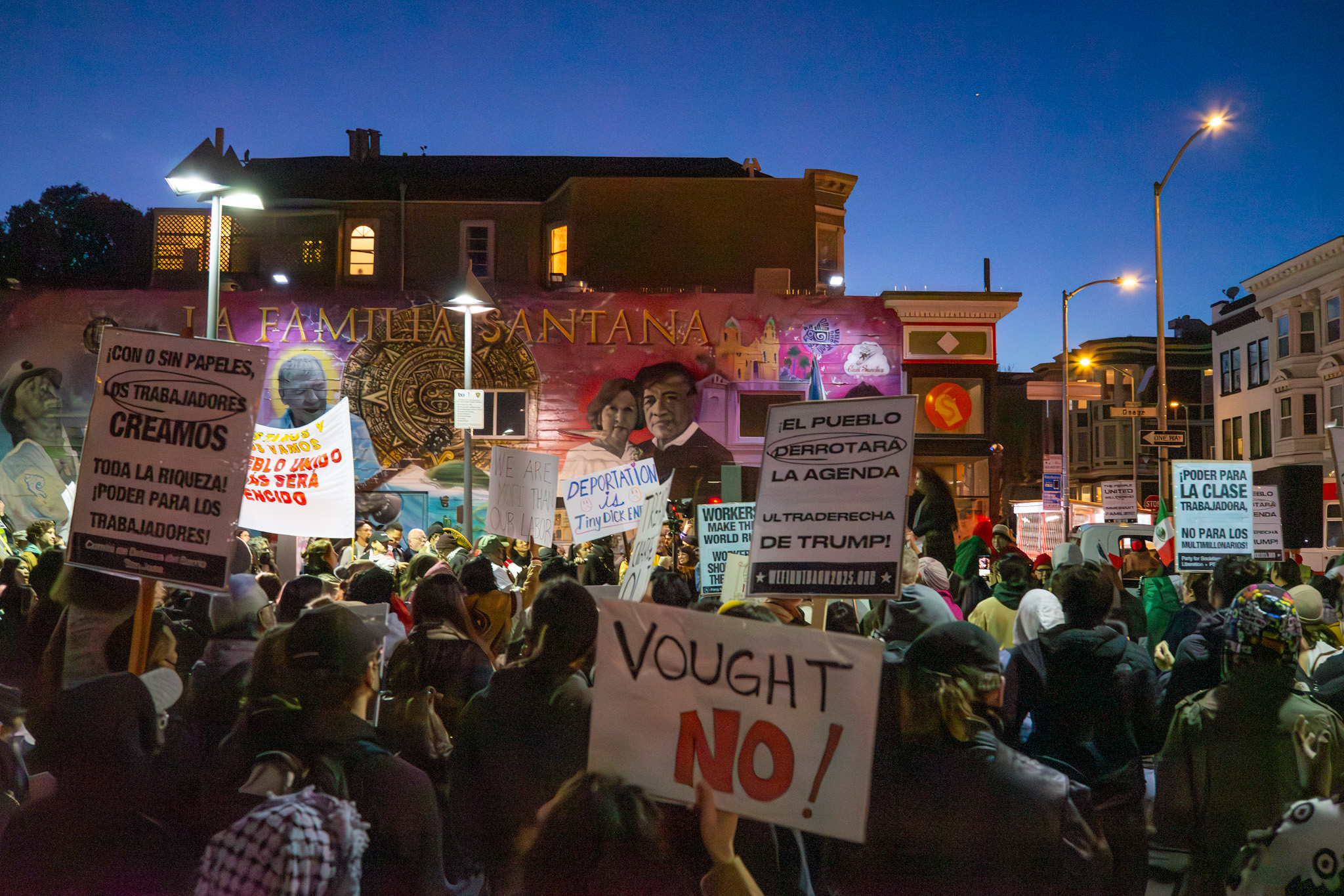 A large crowd gathers for a protest in an urban area. People hold various signs in different languages against political policies. Murals and buildings are visible in the background.