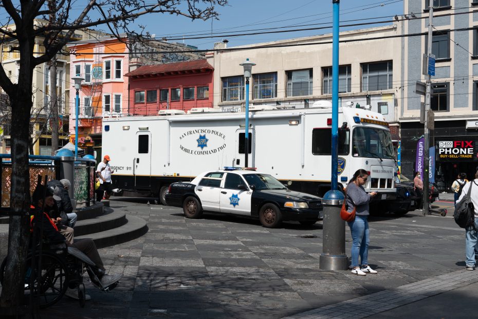 At 10 a.m. Saturday, one police officer was on foot and another sat in his car on the southwest plaza at Mission and 16th streets. The San Francisco Police Department’s mobile command unit remains parked on the plaza.Â