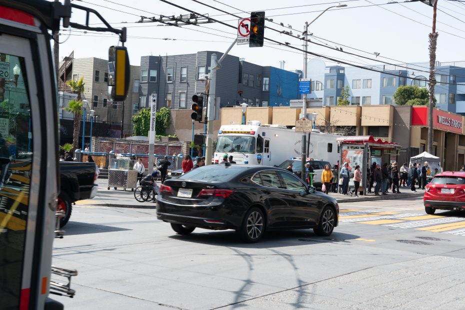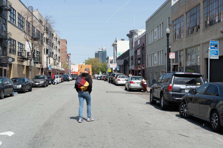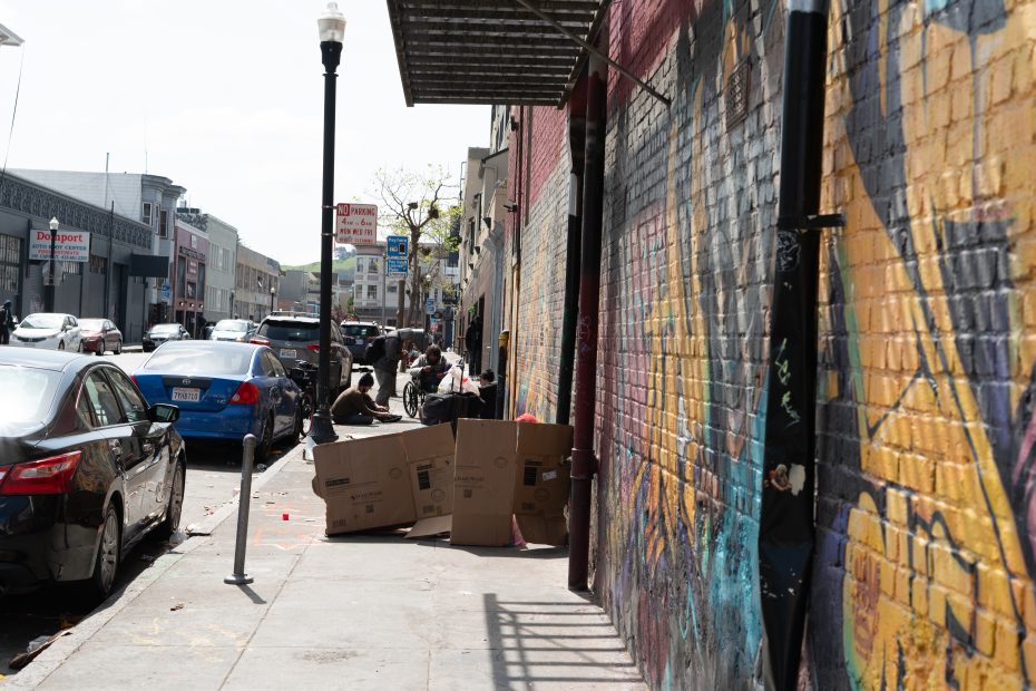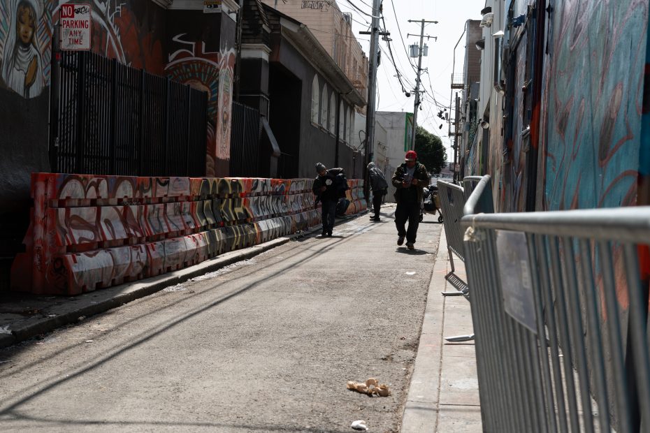 Just steps away, people gathered in the alleyways — some apparently unhoused, some sitting in silence, others quietly interacting. Caledonia Street toward 15th Street was lined with temporary barricades and scattered trash. Capp Street had a small group hanging out.
