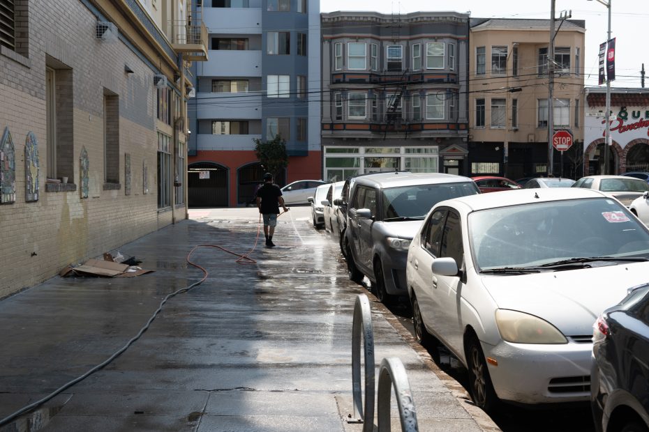 A man hosed down the sidewalk on Julian Avenue, washing away the remains of makeshift cardboard shelters.