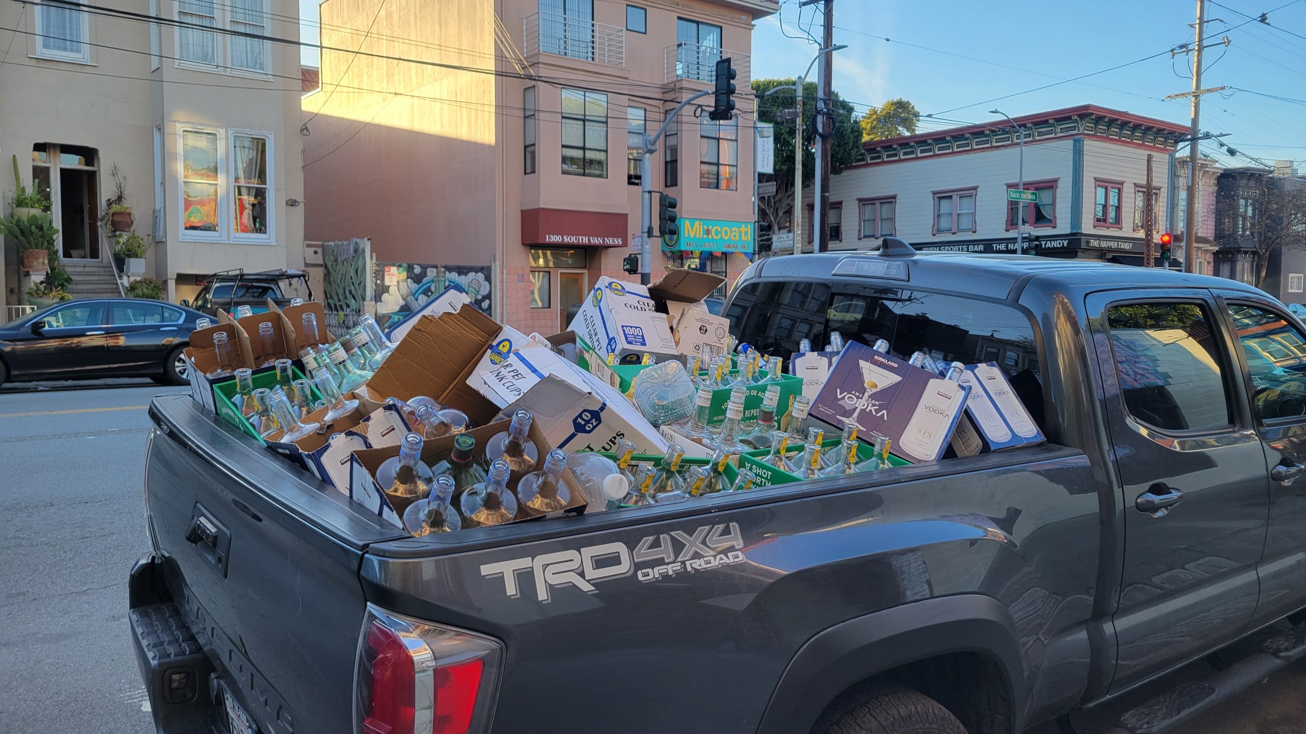 Pickup truck bed filled with recyclable cardboard boxes and plastic bottles parked on a city street.