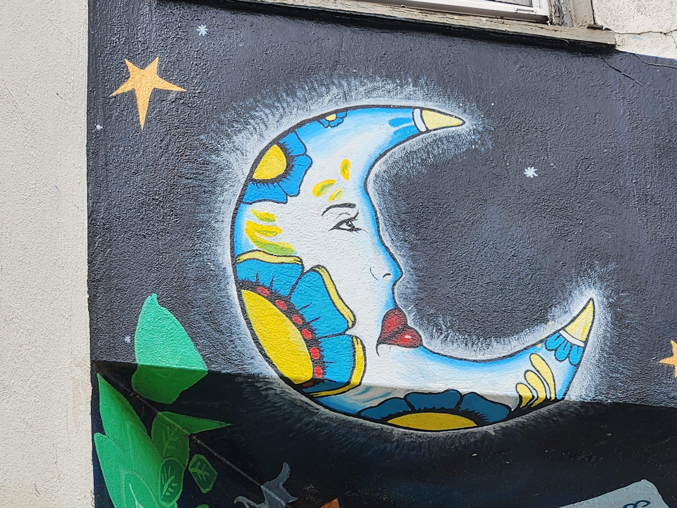 Colorful mural of a crescent moon with a face and floral patterns against a starry night background on a wall.