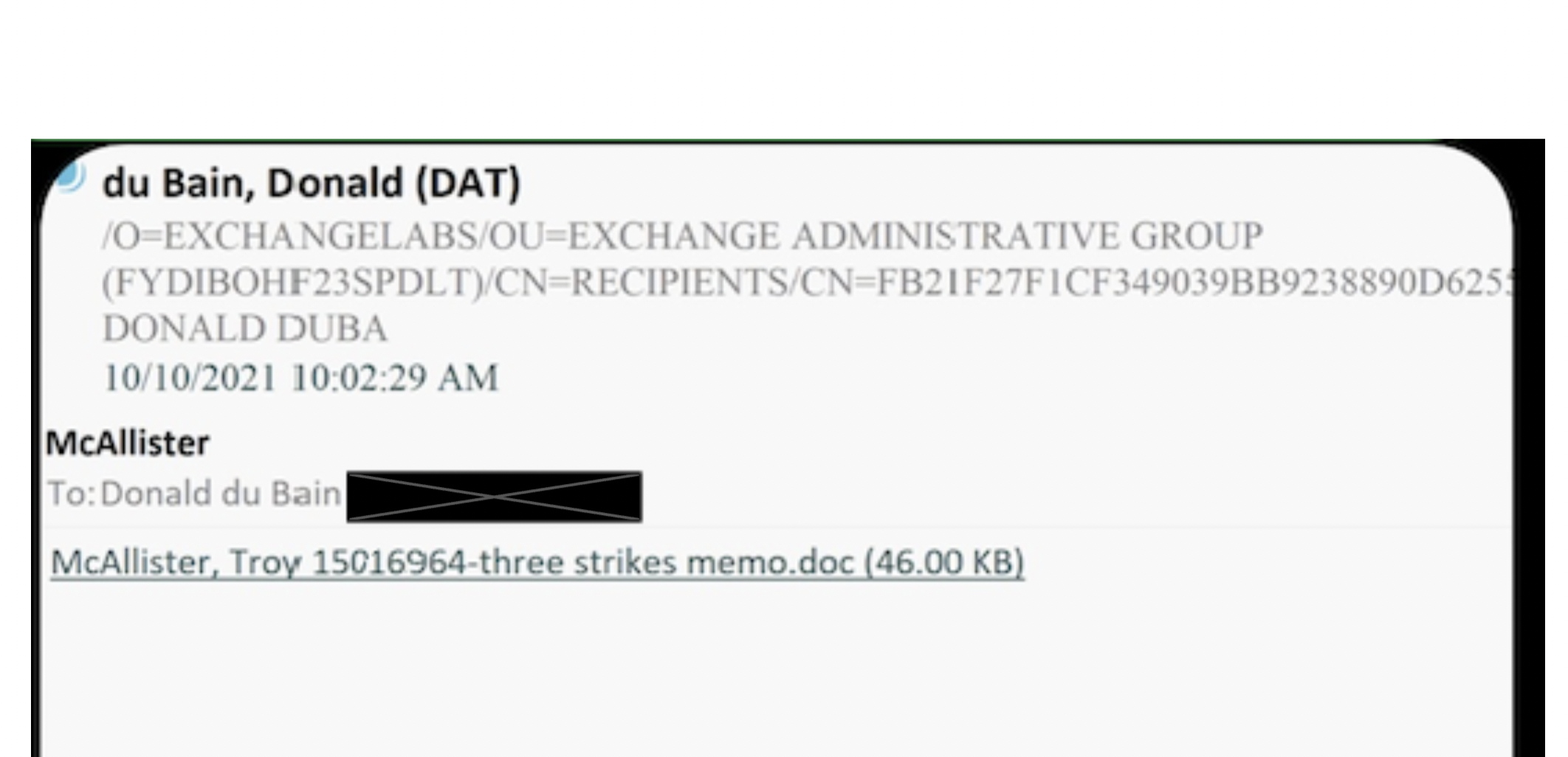 One day after Jenkins emailed du Bain the confidential McAlister rap sheet, according to records obtained by Mission Local, du Bain used his work email to send a file called “McAllister, Troy 15016964-three strikes memo.doc” to his personal email account at 10 a.m. on a Sunday. Mission Local is informed that this was a confidential memo.