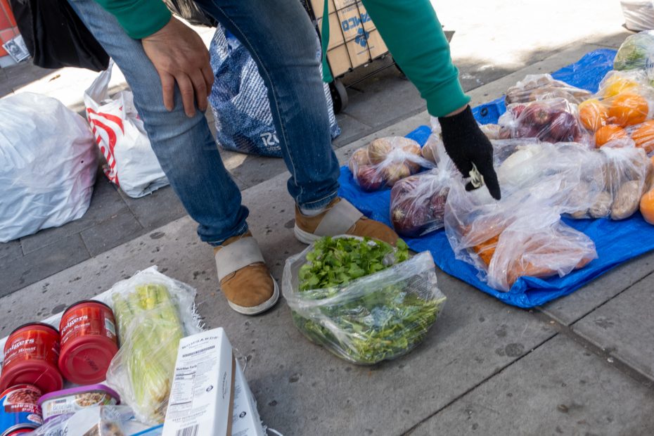 Directly across the northeast plaza, vendors sold food like pupusas and tacos beneath blue tarp canopies. Others offered bagged vegetables, soaps, olive oil, and coffee at folding tables lined along the sidewalk. No one disturbed the unpermitted vendors.