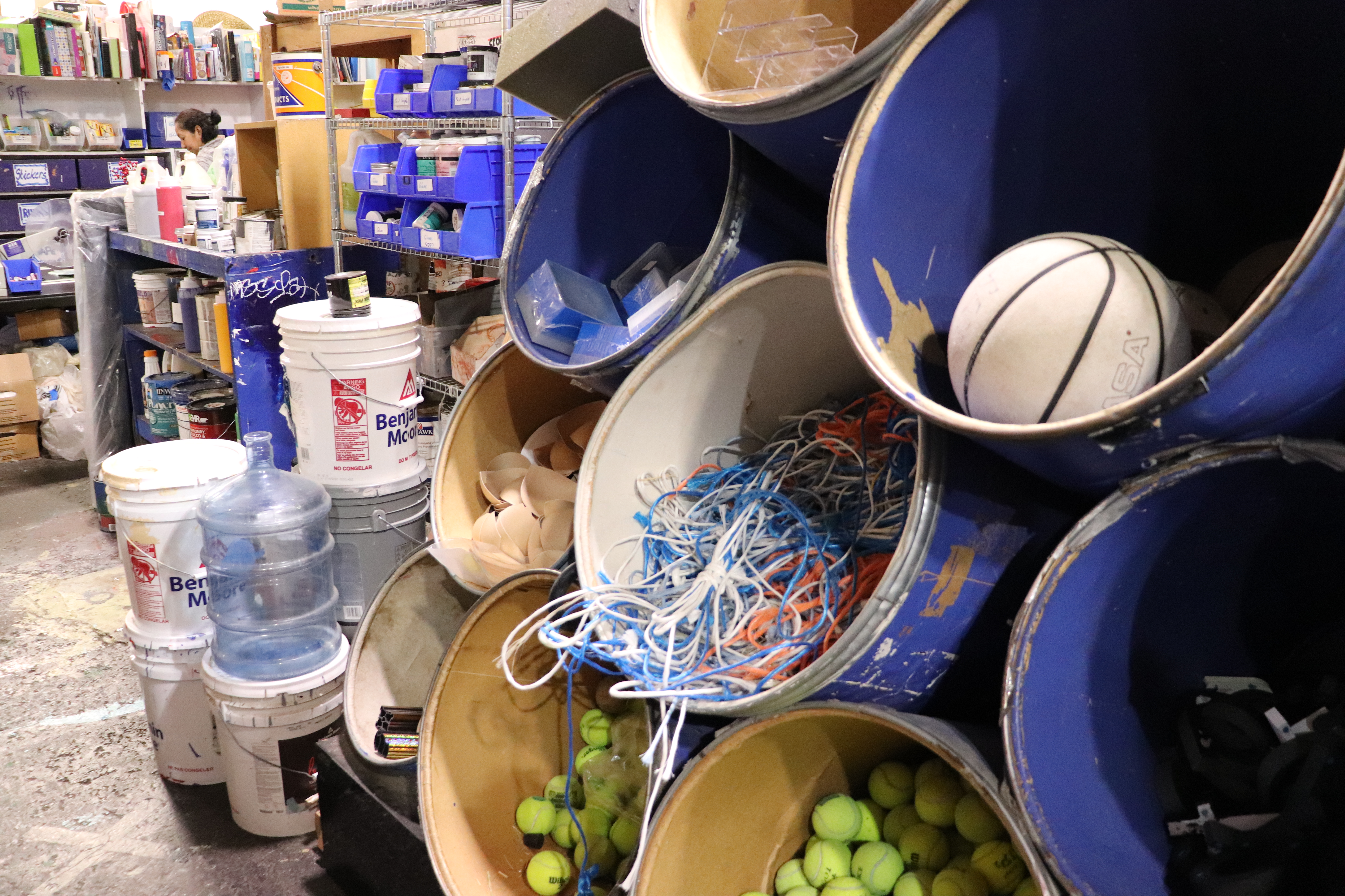 “It’s like Aladdin’s maze in here,” remarked Kochanski, as she weaved through barrels of dozens of identical pink umbrellas, one filled to the brim with tennis balls, another with bra pads. “But you can find anything here and make art from it.”