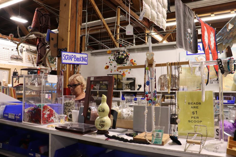 Workers at SCRAP sift through donated items; there’s a small list of items they won’t take, but many have managed to find their way onto a shelf anyway.