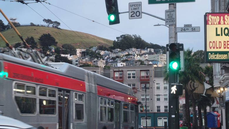 A city street scene with a moving red and silver bus, green traffic lights, street signs, and hillside houses in the background.