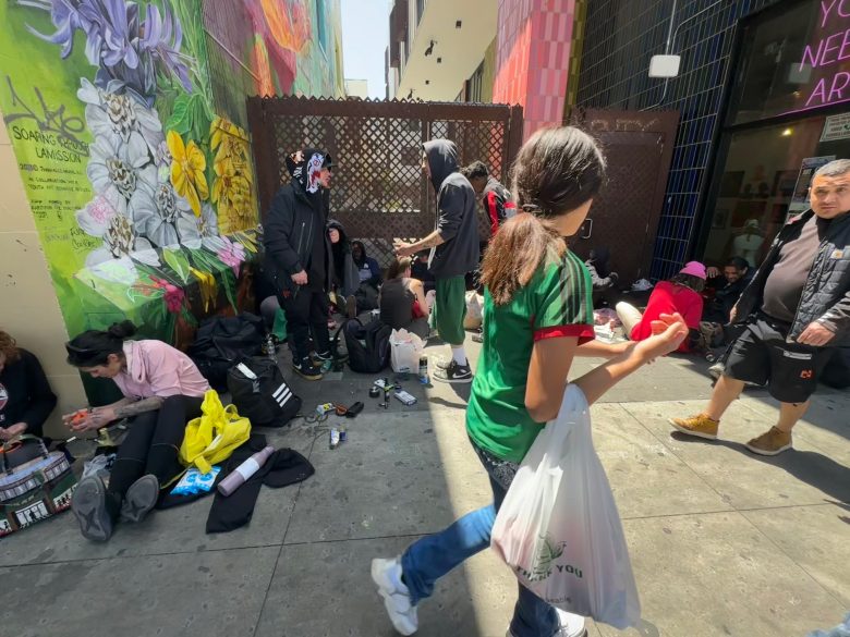 In the photograph, the young girl wears a soccer jersey, her face partially obscured because she is turning to look at the Sunday afternoon scene on Mission Street: What she sees are some 14 men and women hanging out, slumped over or openly using drugs.