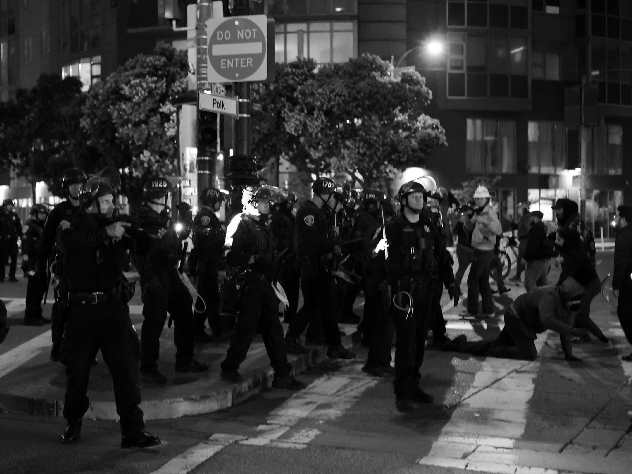 After an hours-long peaceful protest, a contingent of protesters moved from the Mission to Civic Center. By 10 p.m., officers declared an “unlawful assembly.” Dozens of officers proceeded to encircle protesters, several of whom were tackled to the ground and targeted with less-lethal projectiles. Ninety-two people were arrested.