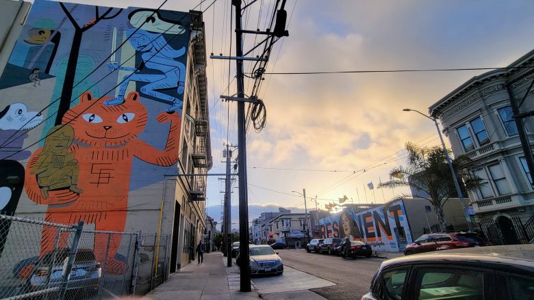 Street view with large colorful murals on building walls, parked cars along the sidewalk, power lines overhead, and a partly cloudy sky at sunset.
