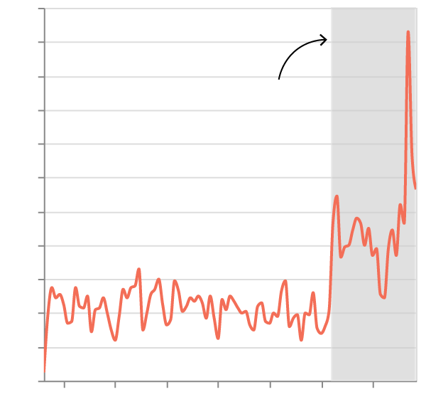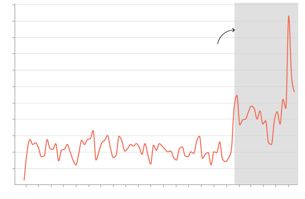 Aquí hemos incluido arrestos administrativos por semana —arrestos por infracciones civiles a la ley de inmigración— dentro del Área de Responsabilidad de San Francisco cuya jurisdicción incluye el norte de California, Hawái, Guam y Saipán. Los datos provienen del Deportation Data Project. Gráfico de Kelly Waldron.