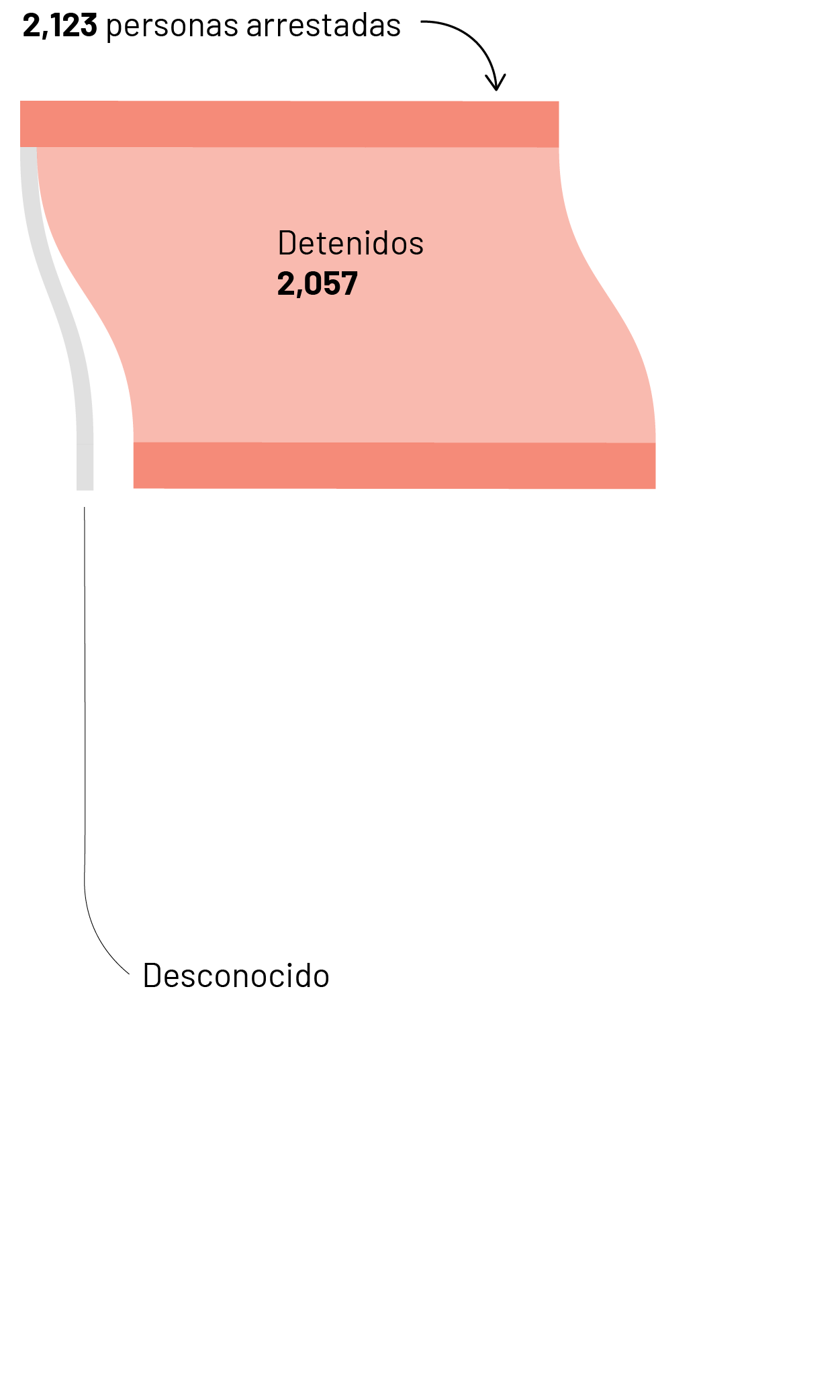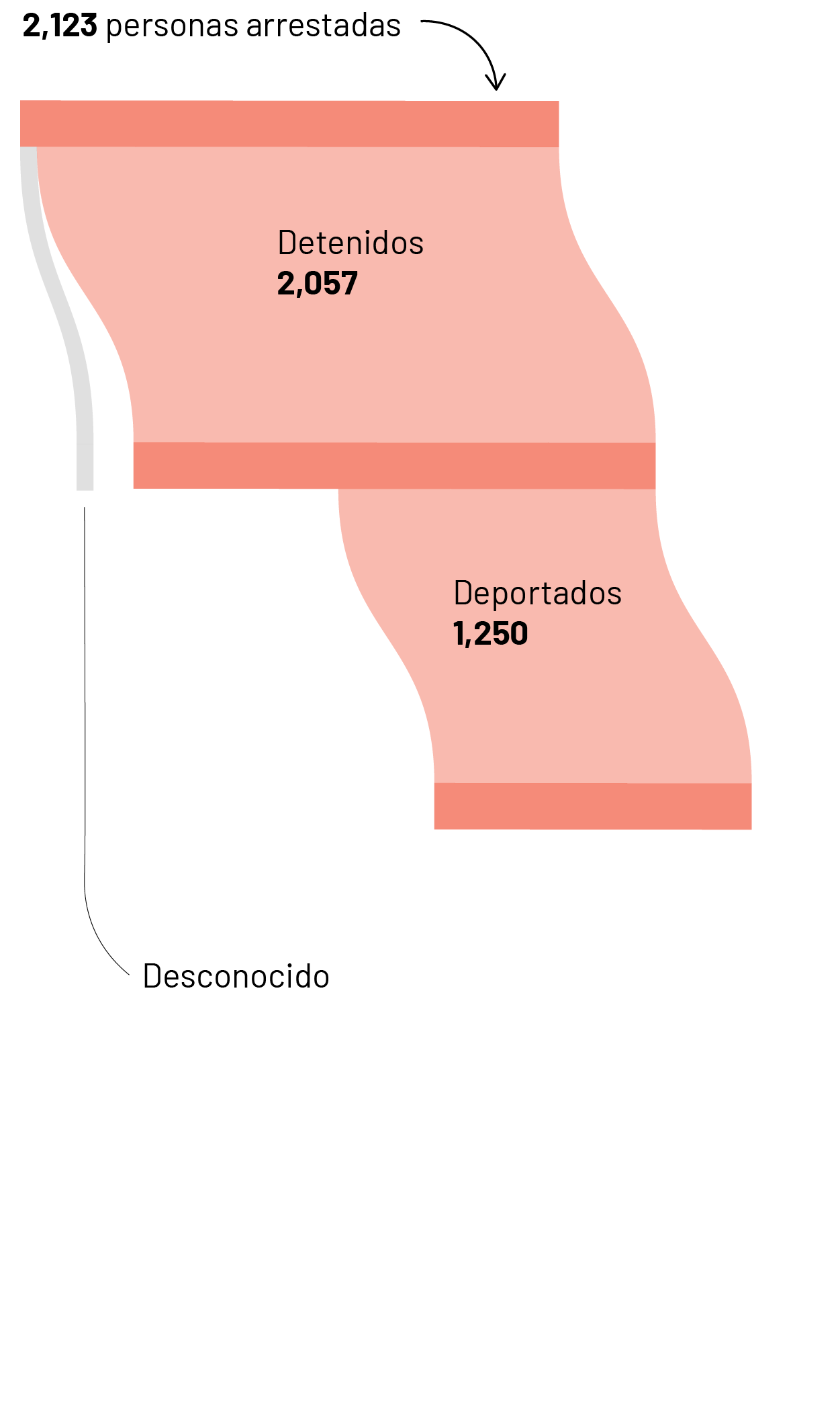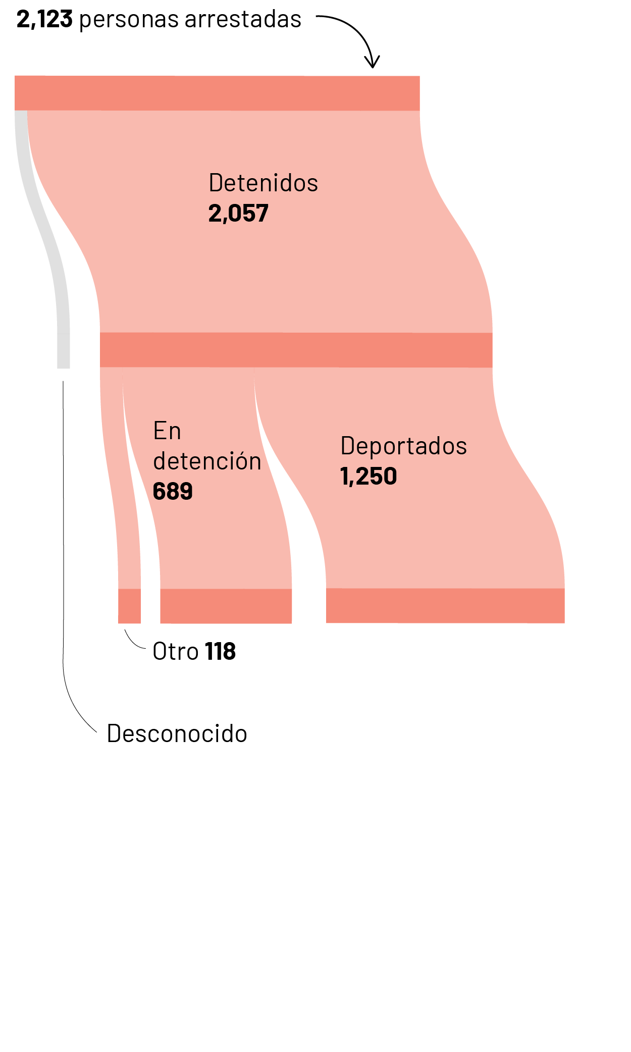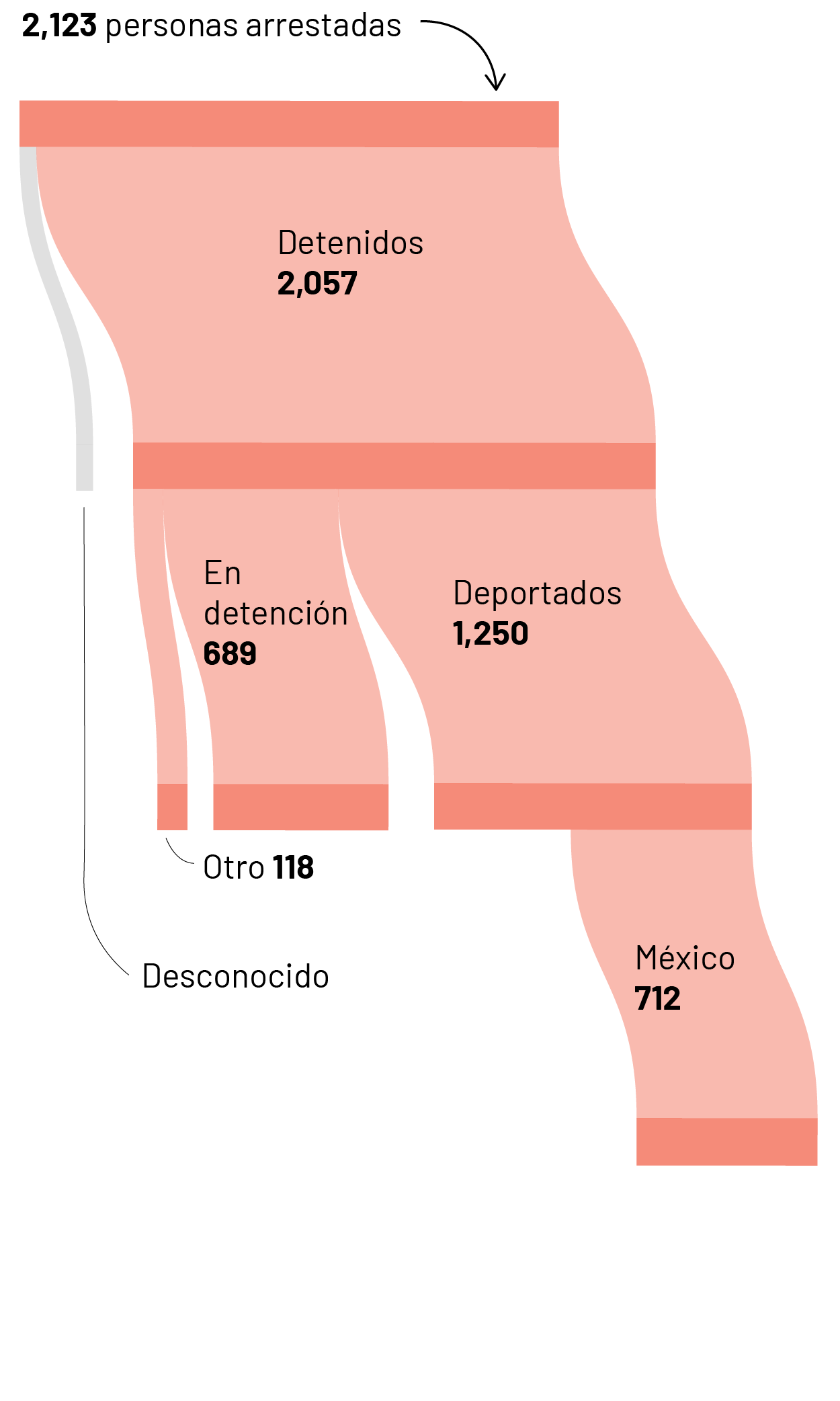 Los identificadores únicos en la publicación son los mismos en todos los conjuntos de datos. Para este análisis, cruzamos los identificadores únicos de los datos de arrestos con los de los archivos de detenciones y expulsiones. Para calcular el total de expulsiones, consultamos el conjunto de datos de detenciones, ya que es más completo. Para calcular el número de personas que aún se encuentran detenidas, calculamos el número de identificadores únicos que no tenían datos en la columna “motivo de suspensión de la liberación”. Para comprender los puntos de partida, utilizamos los datos de expulsiones.