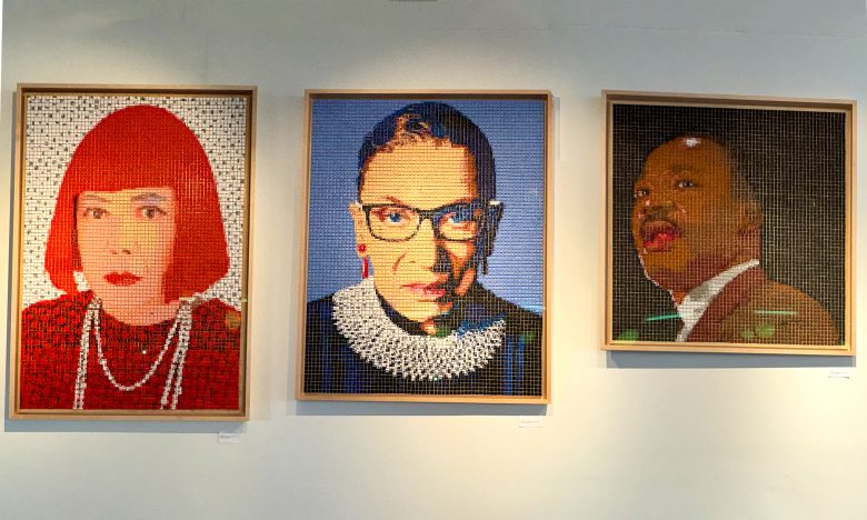 Deep into the artist reception, guests remained engaged with Lanier’s portraits. Below, Victor Young, Sr., discusses the Asawa portrait of 15,000 pieces with his daughter, Silvia Yuen. The Asawa portrait signature piece is the featured portrait of the show.