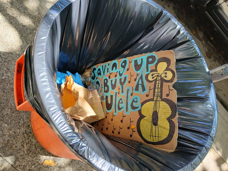A cardboard sign reading "Saving up to buy a ukulele" with a drawing of a ukulele is discarded in a trash bin along with paper bags.