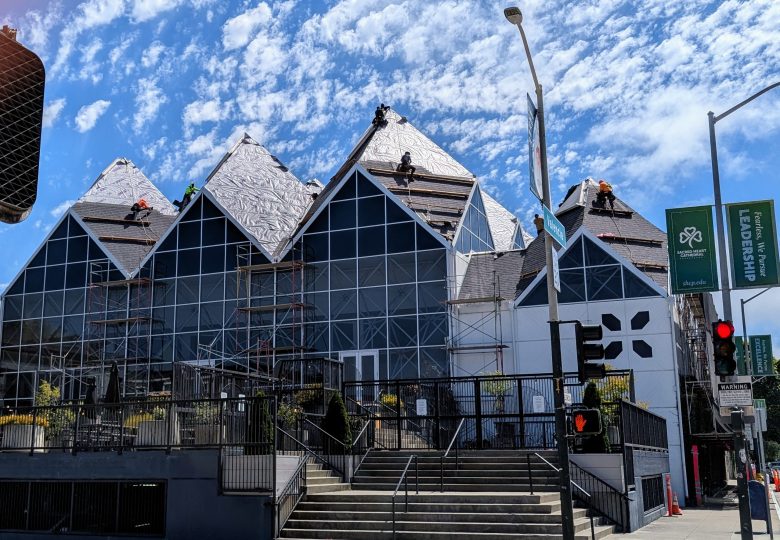 Workers install new roofing materials on the angular, glass-fronted roof of a modern building under a partly cloudy sky. Scaffolding is set up around the structure.