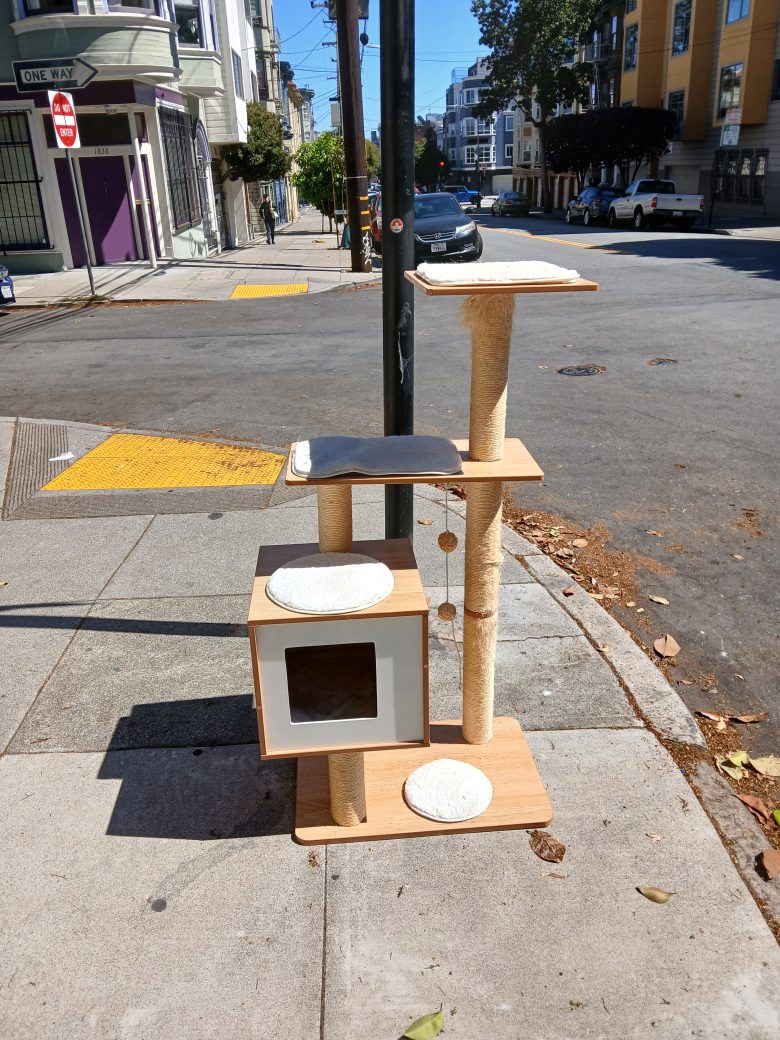 A wooden cat tree with multiple platforms and a cubby is placed on a sidewalk next to a street corner in a city neighborhood.