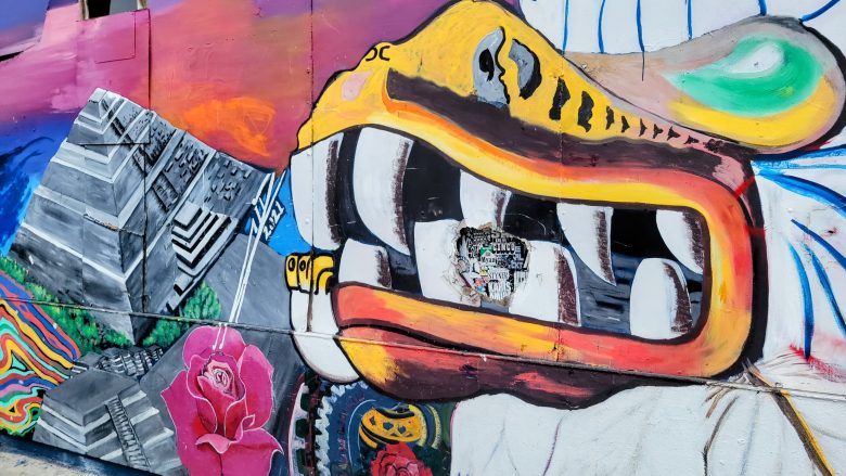 A colorful mural features a large open-mouthed creature, geometric city buildings, a pink rose, and abstract designs against a vibrant background.