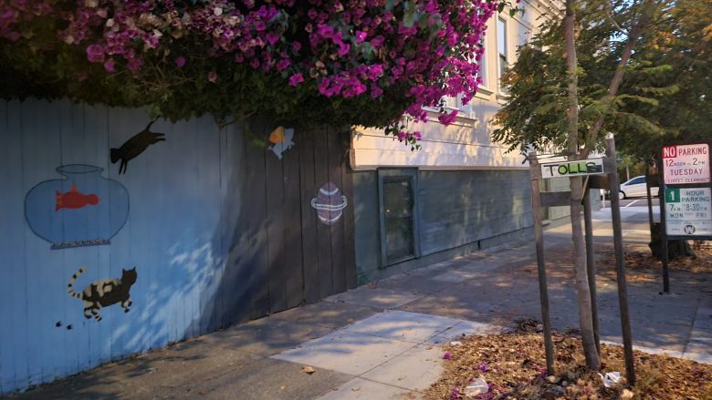 A sidewalk with a mural of a fishbowl, fish, and cat on a wall under blooming pink bougainvillea; street signs and fallen leaves are visible.