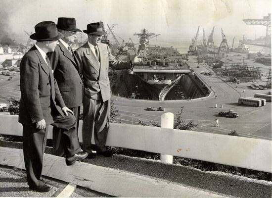 Men overlook the Hunters Point Shipyard, pictured in 1950. Photo courtesy of the National Archives.