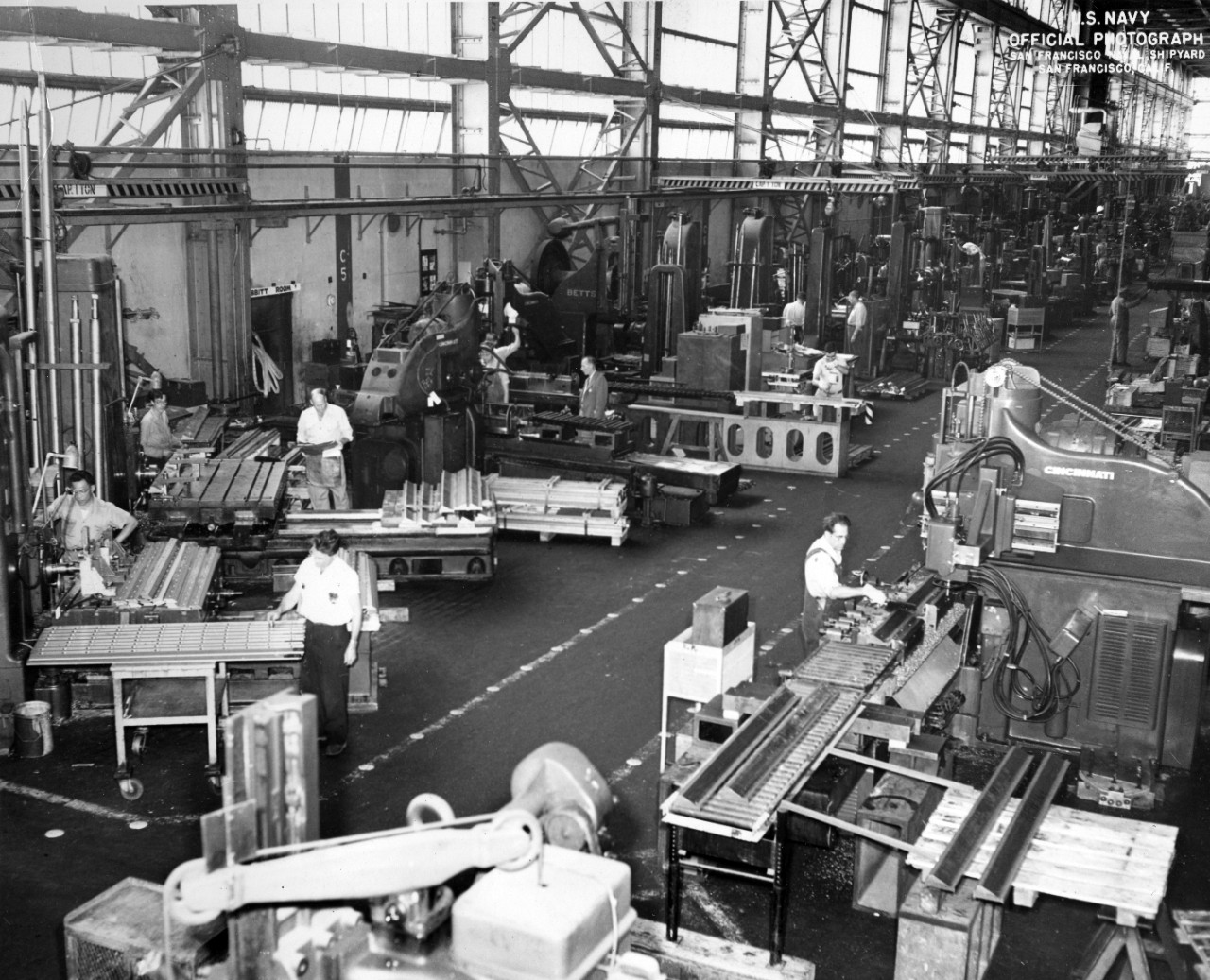 Hunters Point shipyard manufacturing floor, pictured in June 1955. Photo courtesy of U.S. Navy.