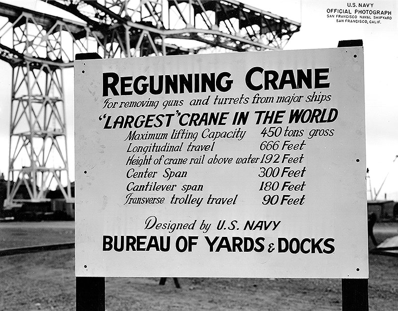 The giant gantry crane is pictured behind a sign advertising the building of the crane on Navy Day, 1946. Photo courtesy of U.S. Navy.