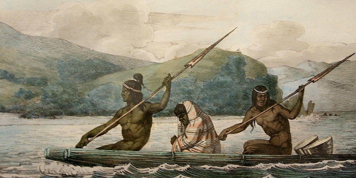 Ramaytush Ohlone in a tule boat in the San Francisco Bay, 1816. Painting by Louis Choris. Courtesy of the University of California, Berkeley Library.