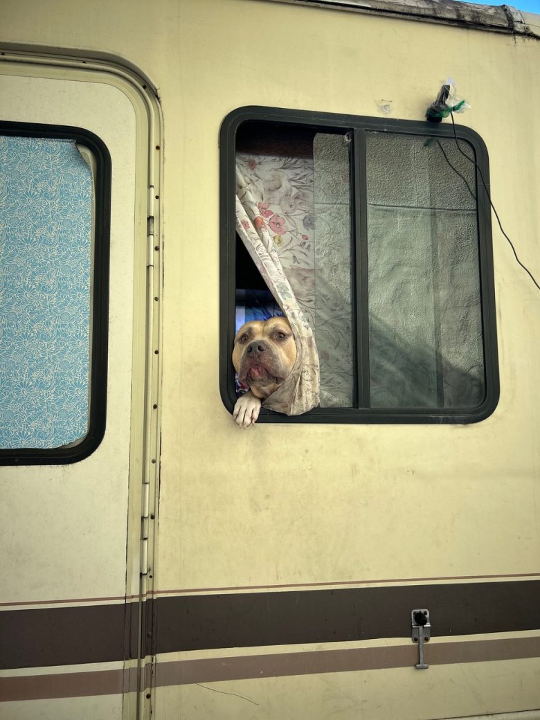 A dog looks out from a partially open window of a beige RV, resting its head and paw on the windowsill with a floral curtain draped over its head.