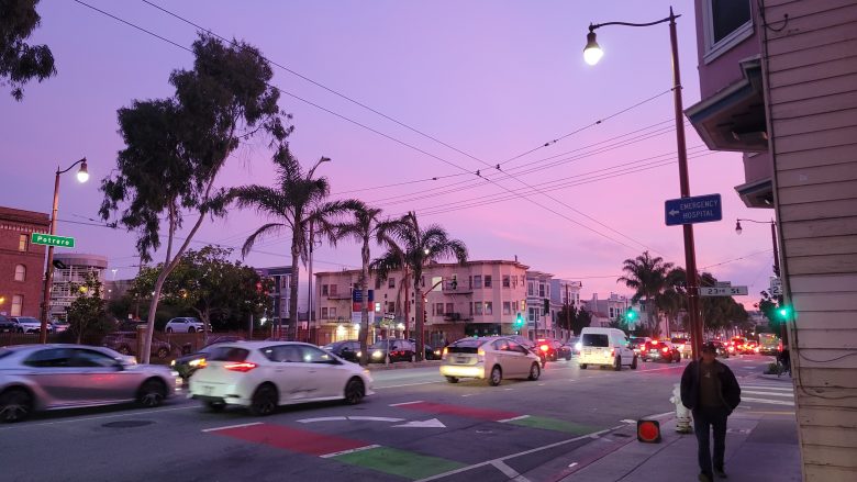 A busy city street at dusk with cars, palm trees, pedestrians, and buildings under a purplish sky. Traffic lights and street signs are visible.