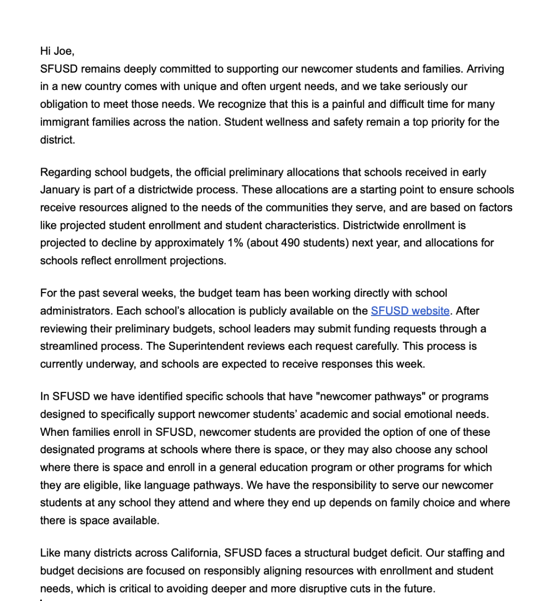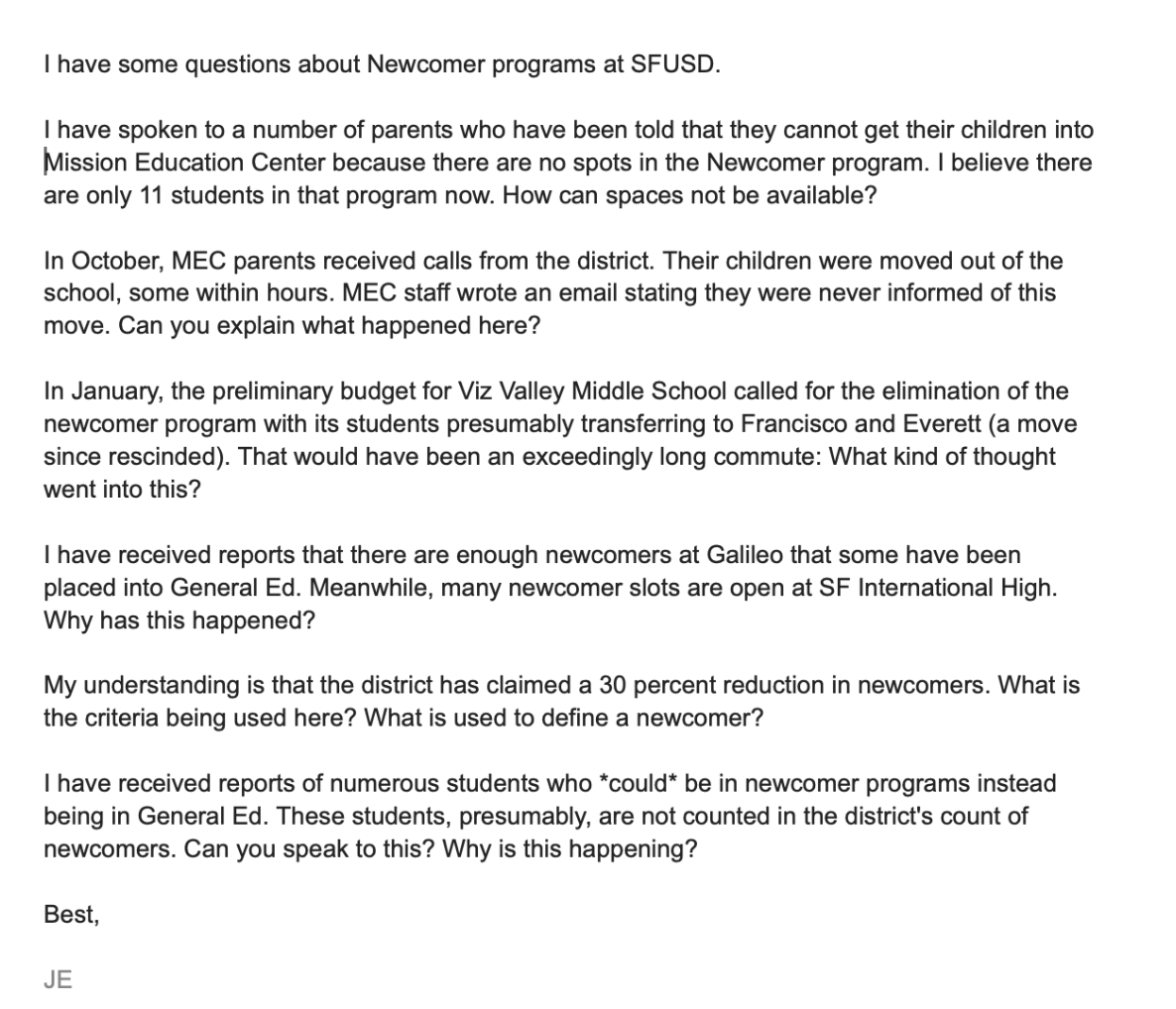 Mission Local sent a list of specific questions to the district regarding newcomer programs. The district replied with a general statement that did not address our questions.