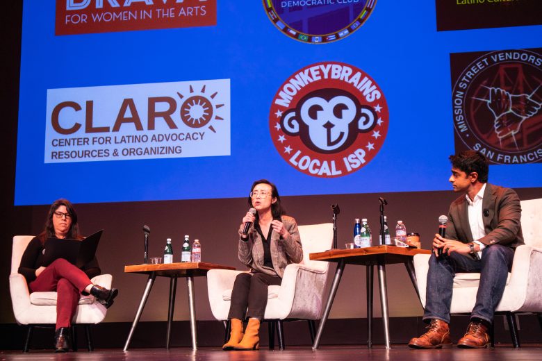 District 1 Supervisor Connie Chan and Saikat Chakrabarti, former chief of staff to New York City Rep. Alexandria Ocasio-Cortez, appeared at Brava Theatre in the Mission District for a debate moderated by Marlen Vasquez, an English professor at City College of San Francisco. The theater was mostly empty, with a crowd of about 70 people.