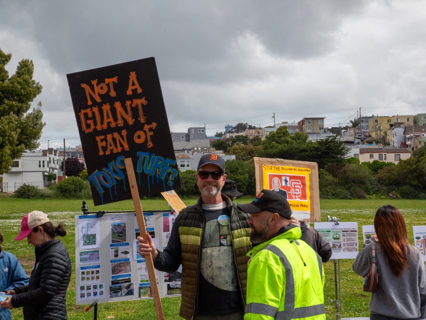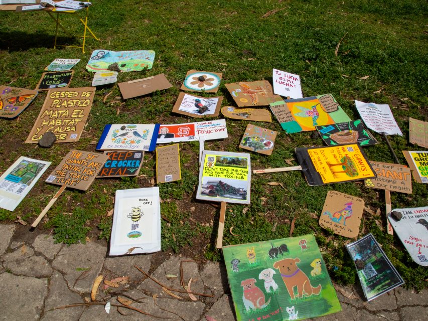 Anti plastic turf signs displayed on the grass field at Crocker Amazon park on April 26, 2026. Photo by Xueer Lu.