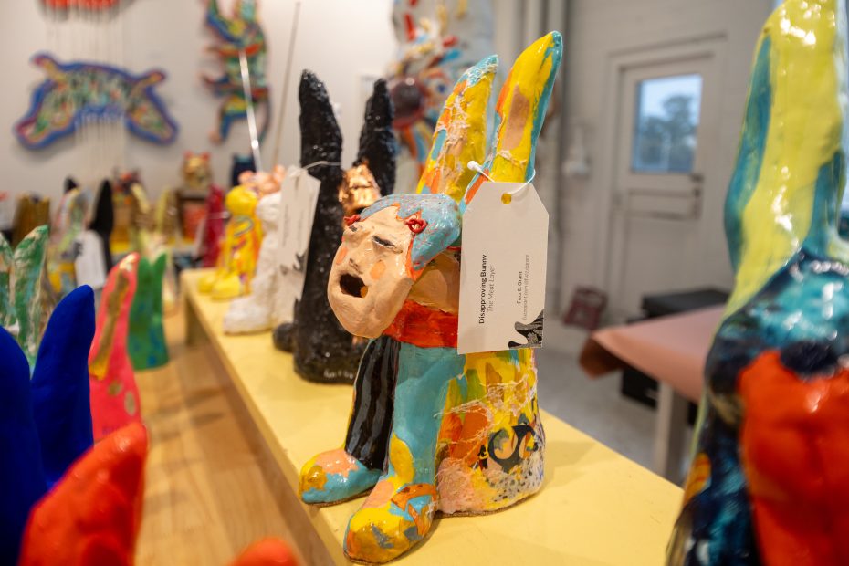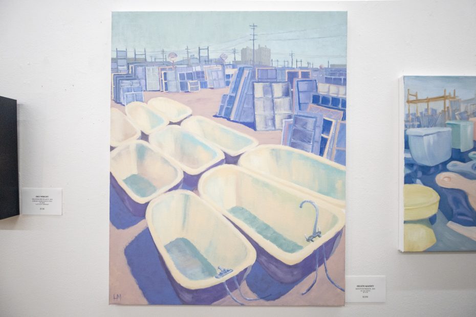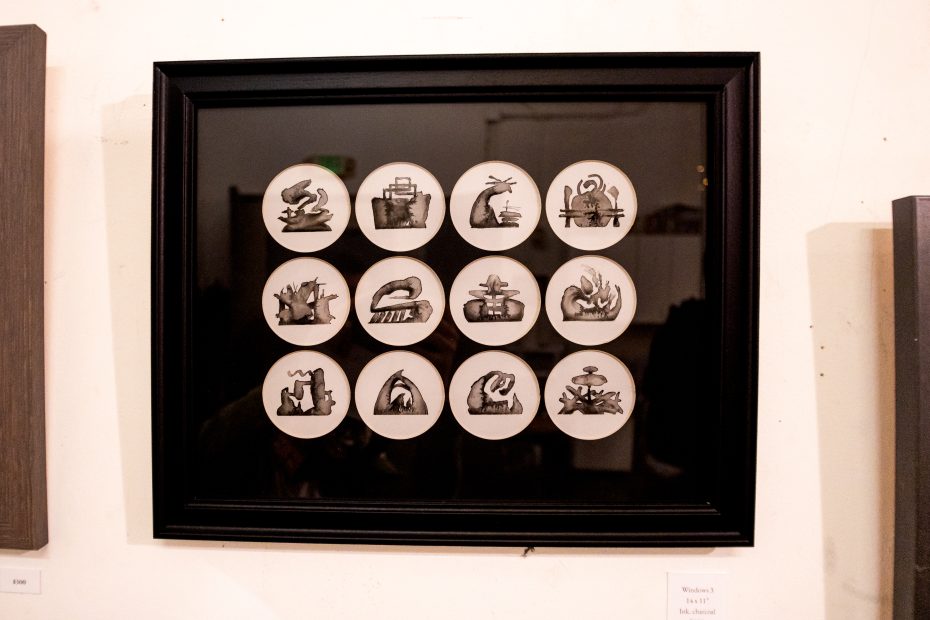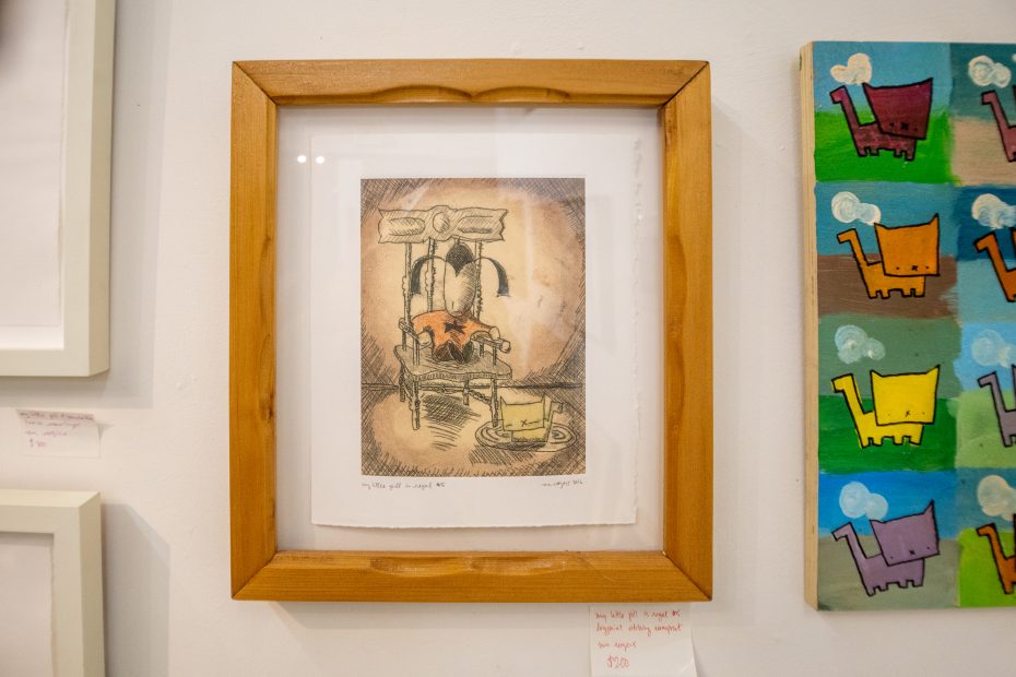 ‘Windows 3’ by Eliot Rattle, ink and charcoal. Photo by Zoe Malen‘Smoke’ by Daisy Eneix, made with ink, gouache, and pencil. Photo by Zoe Malen‘my little pill is regal #5’ by Mr. Rogers, a drypaint etching monoprint. Photo by Zoe Malen‘Bathtub Parade’ by Heath Massey, oil on canvas. Photo by Zoe Malen‘The Meat Layer’ is a part of Fuzz E Grant’s series titled ‘Disapproving Bunny’ representing the perspective of how animals view humans. This work in particular is made from solid plaster and signals to how AI refered to humans as ‘The Meat Layer.’ Photo by Zoe Malen‘Code Switching’ series by Dan Hershman with acrylic, ink, and pencil on wood panel.‘Transition’ by Junona Jonas depicting a woman and her transition from country life to city life. Photo by Zoe Malen‘A Cuchillo Limpio’ by Ana de la Cueva, made with metal and tampiriciran wood resembling the Mexico and U.S. border. Photo by Zoe Malen