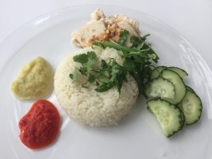 Hainan Chicken Rice – Poached Chicken and Fragrant Rice, with Ginger Scallion Sauce and Chili Garlic Sauce