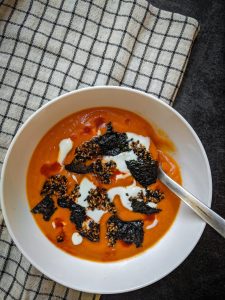 Tomato Soup with Rice Wine, Fermented Bean Paste & Seaweed Chips