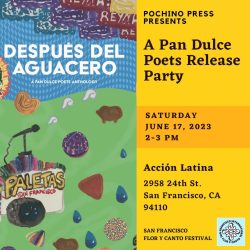 The launch of Despues del Aguacero: A Pan Dulce Poets Anthology (Pochino Press, 2023) will be at this year’s Flor y Canto Literary Festival! There will be pan dulce, coffee, and poetry from Norma Smith, Josiah Luis Alderete, hector son of hector, Amalia Alvarez, Lateef McLead, and Flavia Mora.