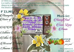 The 143rd Dimension presents evening of live music, fresh juice, and short films. The non-linear and narrative pieces are sensual, experimental, emotional, algorithmic, and reflective.