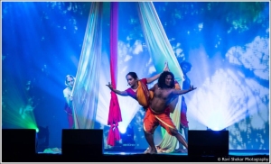 A Story and A Song: A woman can become a flowering tree. When people around her care for it, she thrives but when they abuse the tree… how does she deal with it? A tale of women, environment and love told with wit and dynamic interplay of classical dance (Bharatanatyam), martial art (Kalari), yoga, aerial dance, theater, and live music. A folk tale of a woman who can become a flowering tree exploring the beauty of nature, love and compassion forms the central theme of the show. South Indian stories from A. K. Ramanujan’s translation of folktales and Native American tales by Richard Erdoes and Alfonso Ortiz and local tales and songs by grandmothers, parents, friends and family have inspired the creation of A Story and Song. Aparna Sindhoor is indebted to her father Prof. Balasubramanyam for the treasure of songs and to her mother Dr. Srivalli for telling stories with an alternate perspective. The performance encompasses live singing, spoken word, aerial dance, theater and contact improvisation in a powerful way that has mesmerized the audiences around the world. Critics have called Sindhoor & Natyaveda’s choreography: “breath taking!” and “tantalizing.”