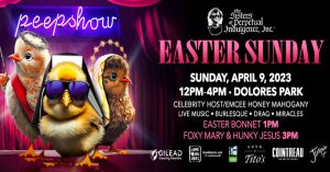 Sisters’ Easter – “Peep Show” is produced by the San Francisco Sisters of Perpetual Indulgence, Inc. in conjunction with event partners San Francisco Recreation and Parks, Love Dolores, JK Sound, and Recology. Peep show would not be possible without the support of our amazing allies, platinum sponsor GILEAD, and sponsors Tito’s Vodka, Junipero Gin, Cointreau, and Falcon | NakedSword.