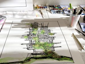 Chris Stokes uses mixed media to interlace and layer unassuming combinations of color, lines and found materials. Elements from literature, cultural symbols, and architecture meld together to become art that equals more than the sum of its parts. Born in Philadelphia, the long-time San Francisco resident’s work is a reflection of his travels, his ever-evolving perspective of the world, and an interest in science fiction. The resulting pieces represent new landscapes and structures that seem barely possible.