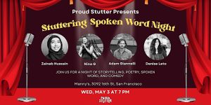 Please join us for a night of storytelling, spoken word, poetry, and comedy to amplify & celebrate stuttering voices at the Stuttering Spoken Word Night! Hosted by podcaster and stuttering advocate Maya Chupkov, the evening’s Slam will feature comedian Nina G and poet Adam Giannelli, among other talented storytellers and performers.