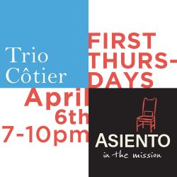 Join us for 'First Thursday' Live Music featuring Trio Côtier at Asiento in the Mission! Trio Côtier performs upbeat jazz standards with a 'cocktail vibe' that shouldn't be missed.