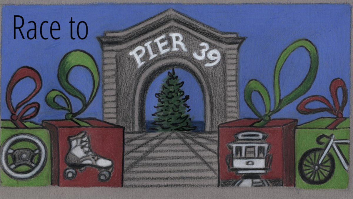 Four reporters race to Pier 39 using different modes of transportation; bike, roller skates, car and public transit. Who will win? Illustration by Molly Oleson